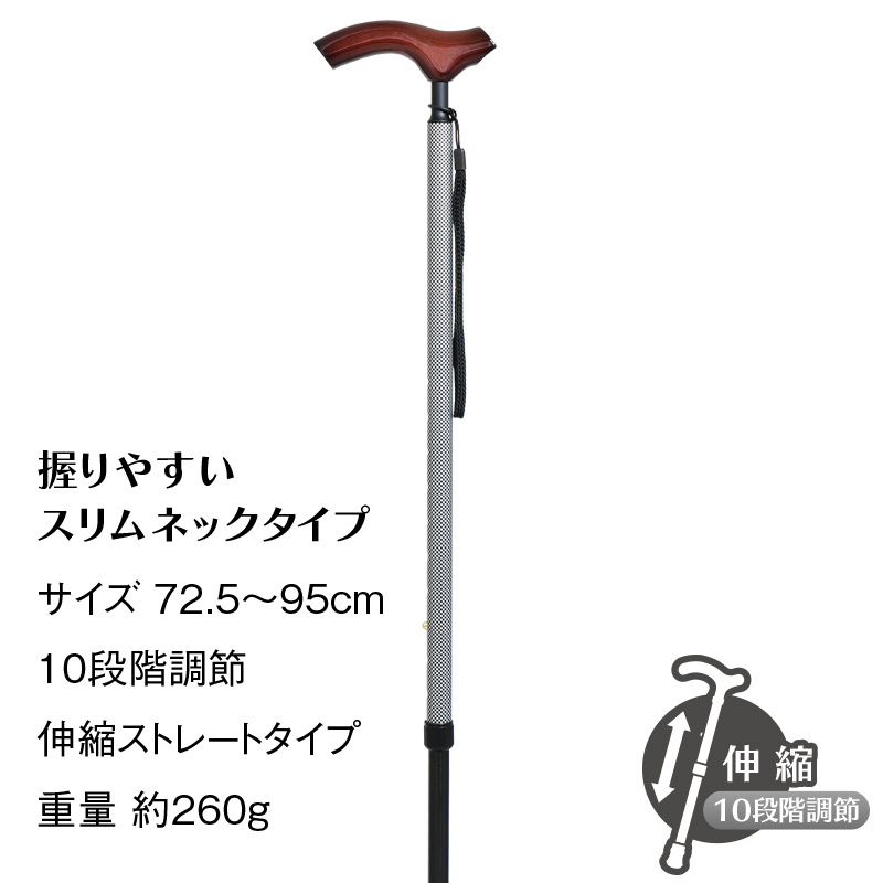 握りやすいスリムネックを採用、基本機能を備えたベーシックなアルミステッキ(ストレート伸縮タイプ)です。