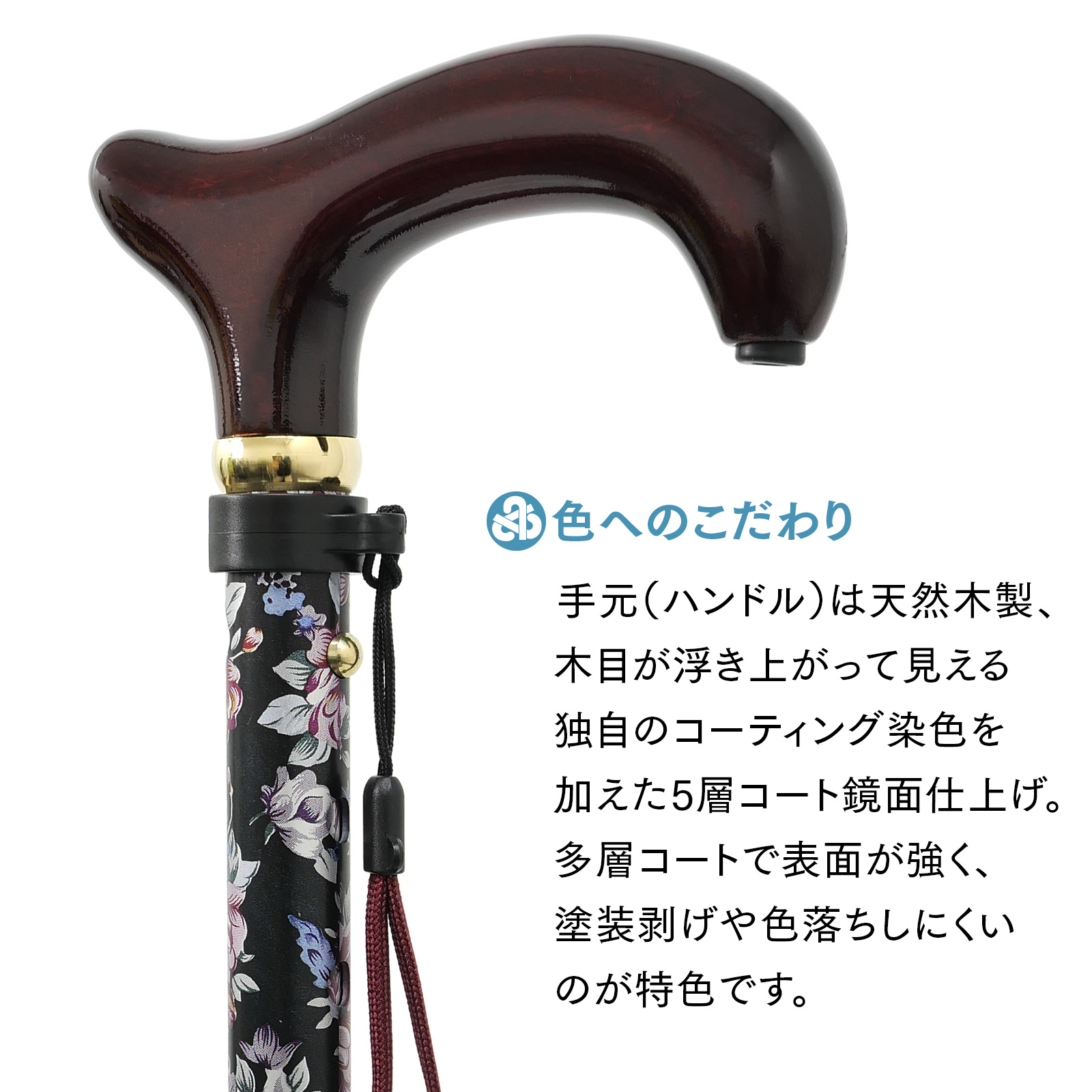 黒を基調とした、美しい花柄デザインに仕上げた5段折タイプのアルミ折りたたみステッキです。