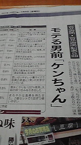 7月8日の日経MJの記事であり、決して誤解のないように!!とろけるような優しい味とのキャッチで豆腐のランキングで京都・南丹市の「ケンちゃん」豆腐がベストワンに選ばれたそうです。暑い毎日淡白な食材で過ごす中で、とろけるような豆腐は有難そう。丹波・美山は実は南丹市なので「食べ歩る記」の楽しみが又ひとつ出来たが、我社の商品も何かのベストワンになるよう頑張ろう。