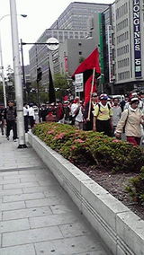 大阪・淀屋橋でメーデーのデモと出合った。“アアそうだ 本日は労働者の祭典だった” っとそれまで全く忘れていた。こんなに労働環境も変化しているのにのんびりデモっている事に何か前時代を感じてしまっているので少し控えめなのか・・・社会保険事務所や官公労の組合員も自分たちの責任を感じて参加しているのだろうか。それとも自分達が労働組合の支持によって当選したことをすっかり忘れ、「年金問題」は自民党の責任だと叫ぶ霞ヶ関の野党の政治家同様 ノー天気な 労働者なのだろうか。・・・
