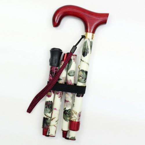 大輪の花を描いたデザインが魅力のダービー型ハンドル四つ折りアルミステッキ。