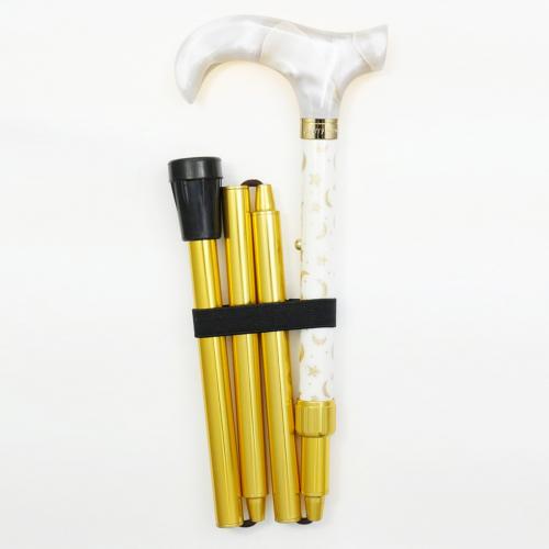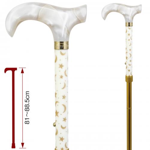 月と星をかたどった、光沢感のある美しいレース生地を支柱にコーティングした人気の高いダービー型ハンドルの四つ折りアルミステッキ。優雅な雰囲気が、上品で爽やかなアクセントを添えてくれます。