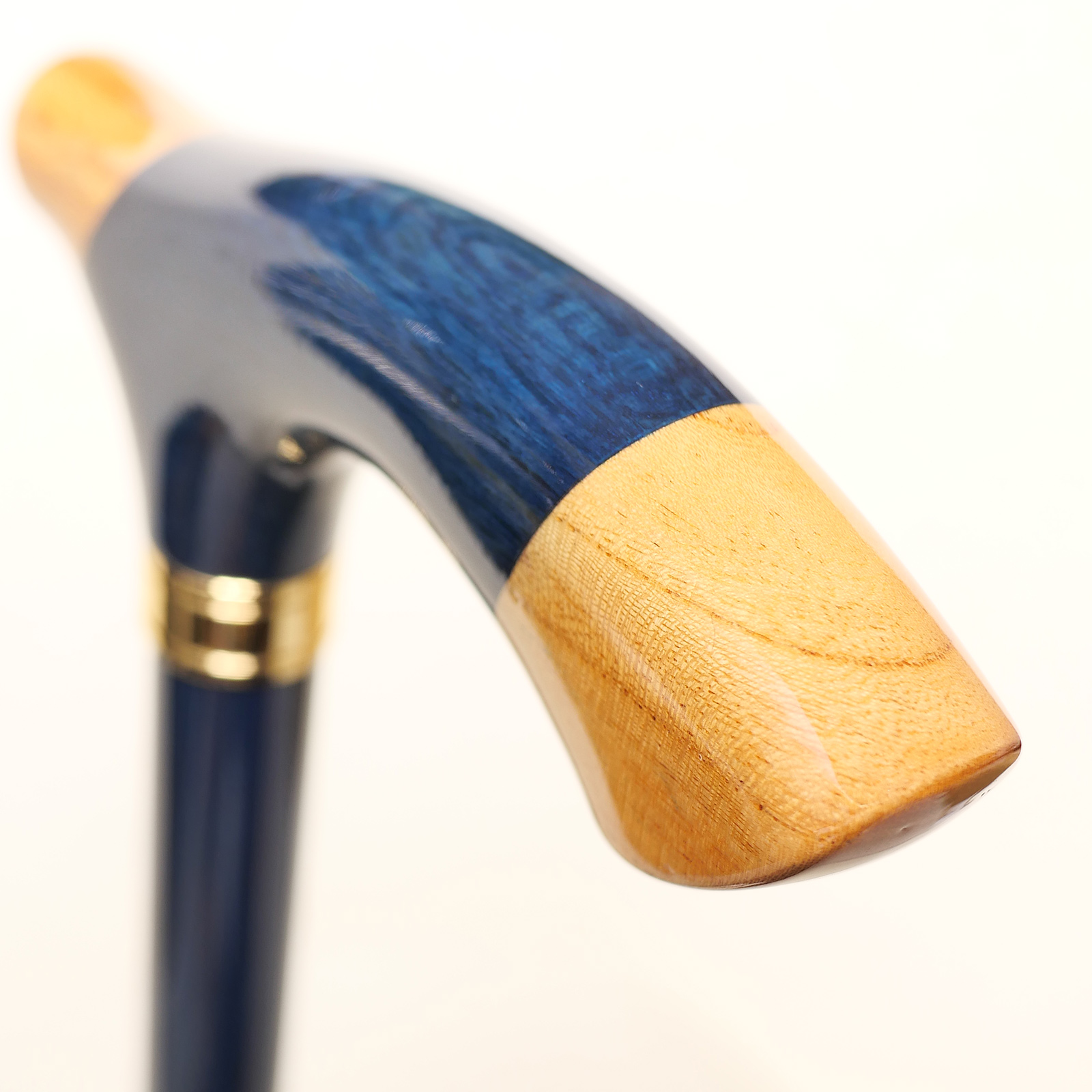 このステッキのハンドル(手元)は、異なる樹種を独自の技法で繋ぎ合わせた「組木手元」。