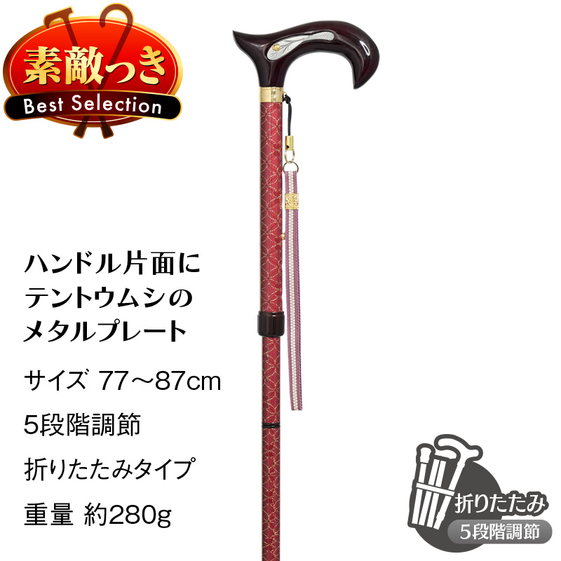 グリップ片面に、可愛い金のてんとう虫をあしらったプレートを埋め込んだ折りたたみステッキです。