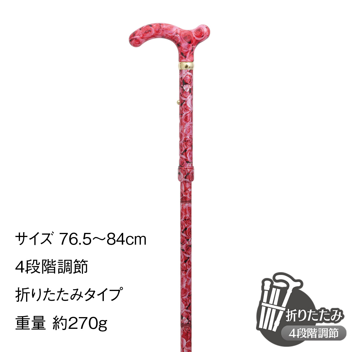 ハンドル部分から支柱まで、すべてを美しい花柄で包んだ4つ折アルミステッキです。