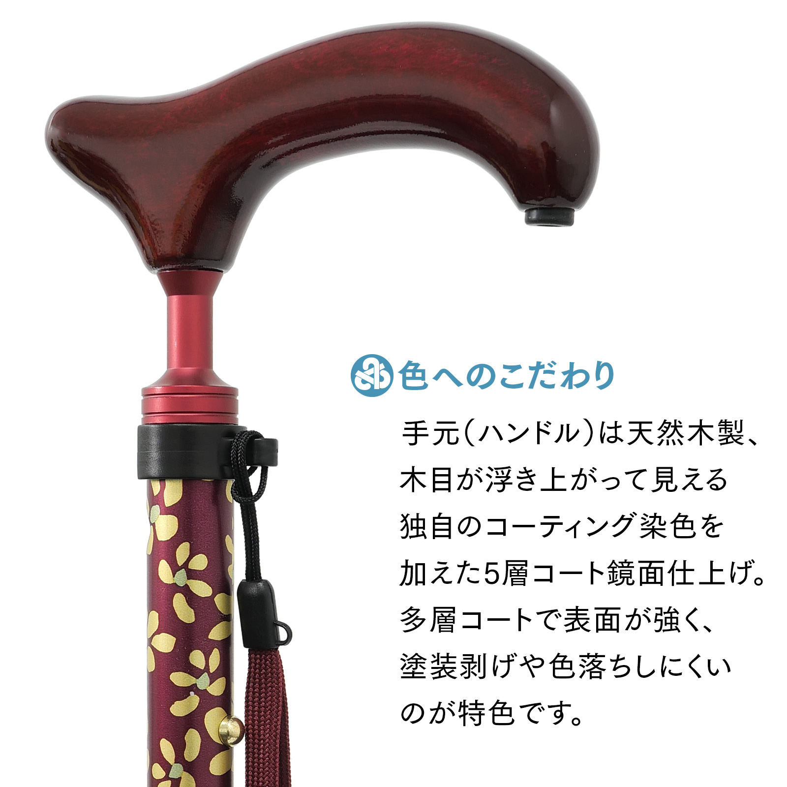 赤を基調とした、シンプルで上品な花柄デザインに仕上げた4つ折タイプのアルミ折りたたみステッキです。