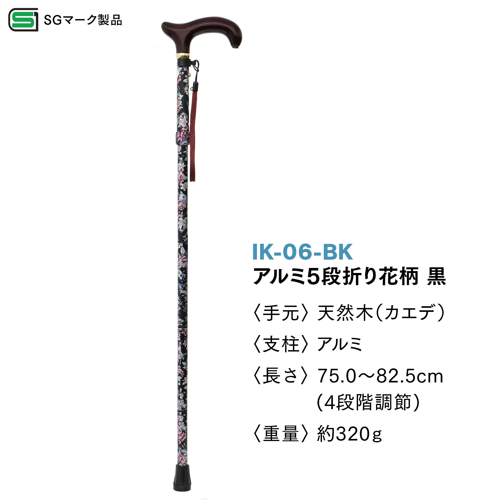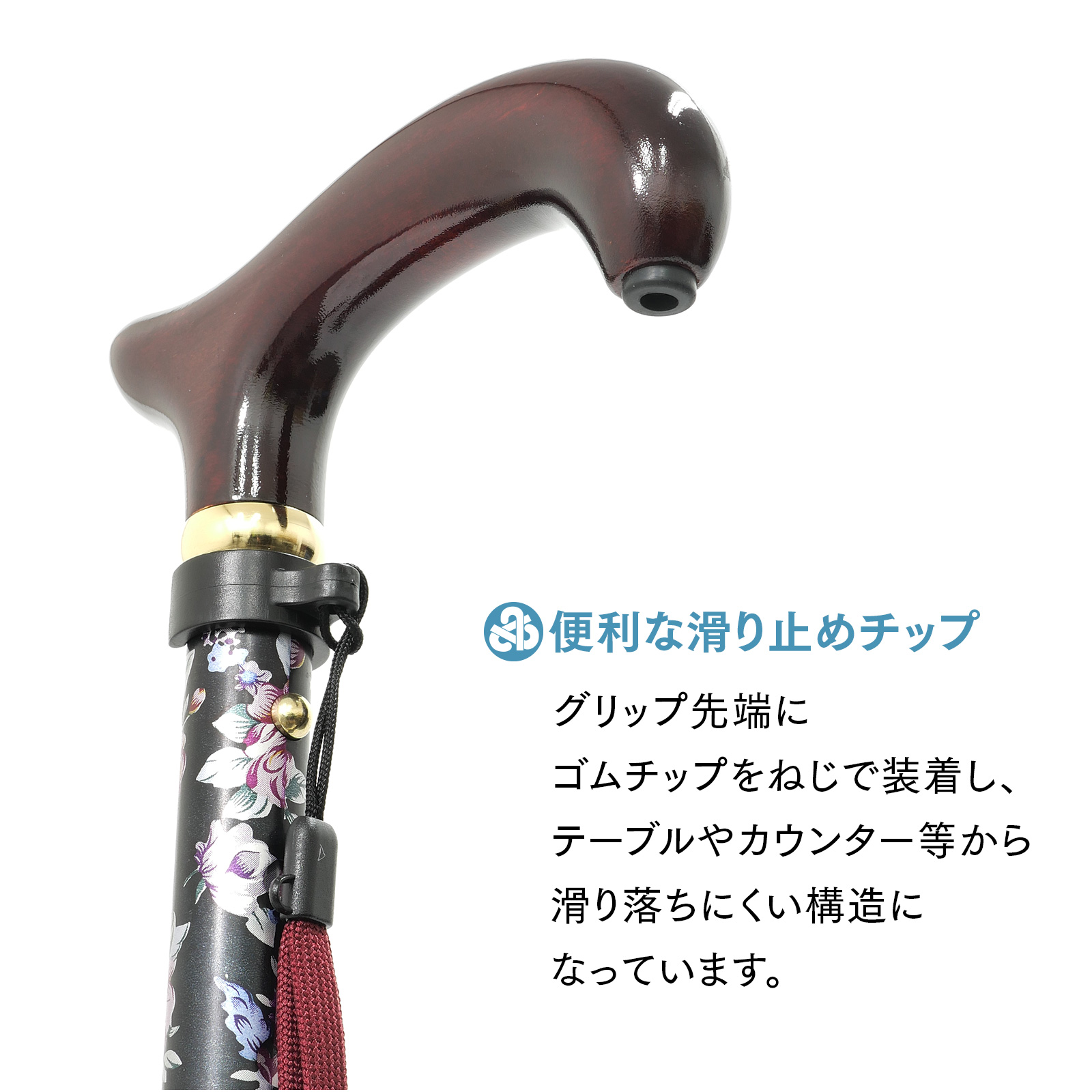 黒を基調とした、美しい花柄デザインに仕上げた5段折タイプのアルミ折りたたみステッキです。