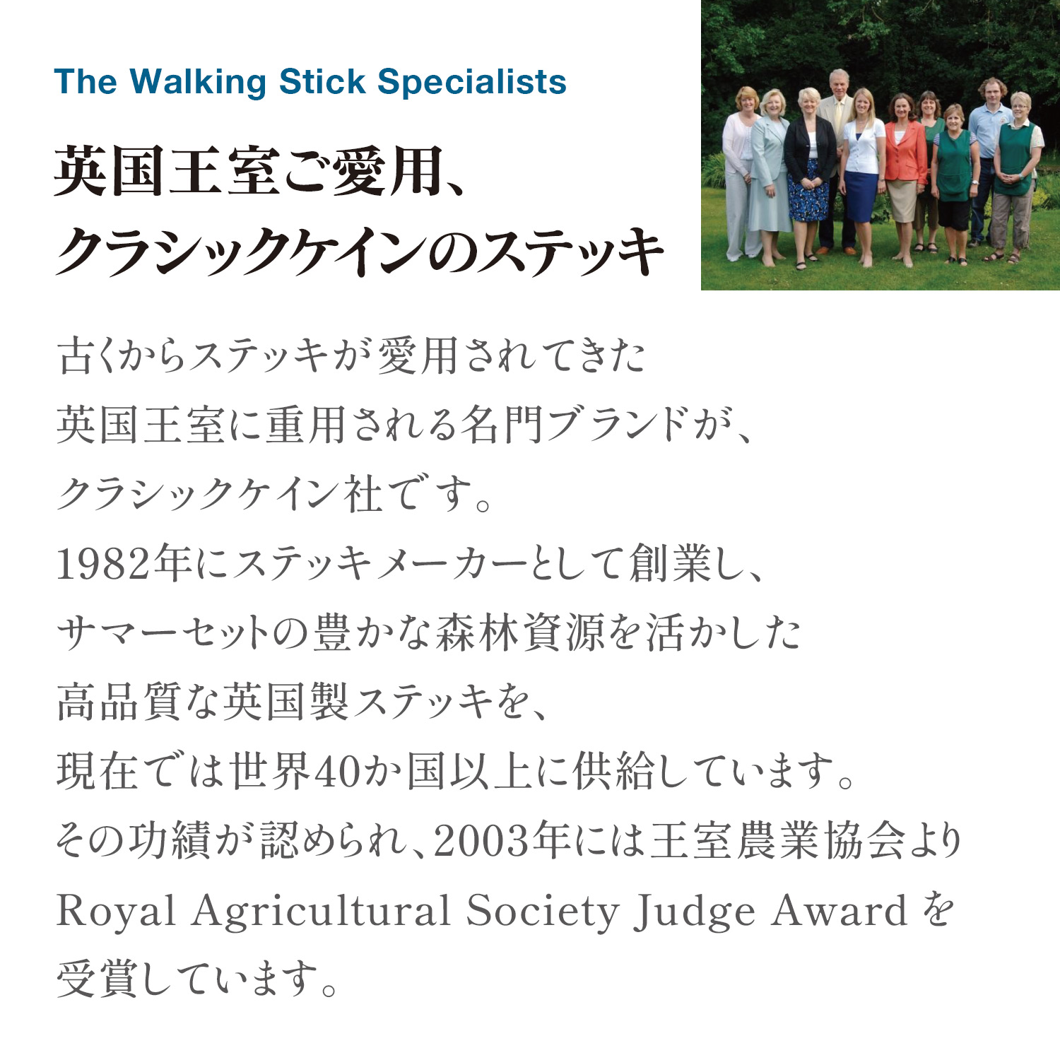 現在では、英国最大級の高級ステッキ製造・卸売会社として成長し、その製品は世界40か国以上で愛用されています。
